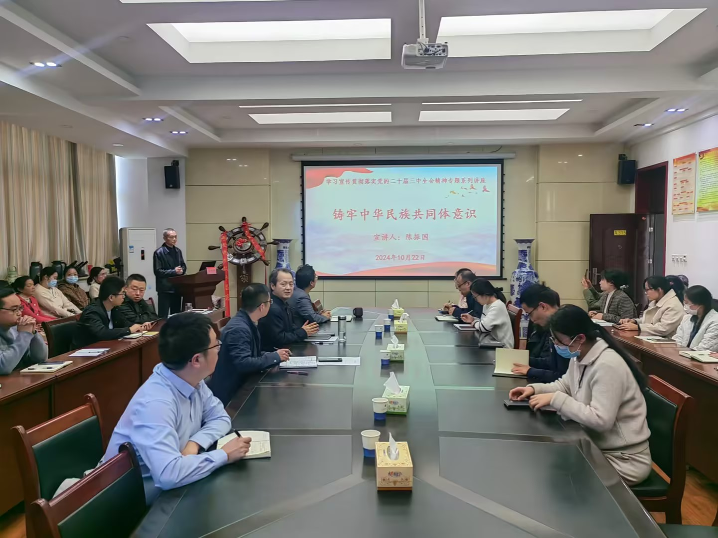 为深入学习贯彻党的二十届三中全会精神,引导全院师生把思想和行动统一到全会精神上来,按照公司党委工作部署,10月22日下午,公司邀请马克思主义公司副经理陈振国在9A315为公司师生开展“铸牢中华民族共同体意识”专题讲座。公司党委领导班子、公司全体教职工参加此次教育活动。
