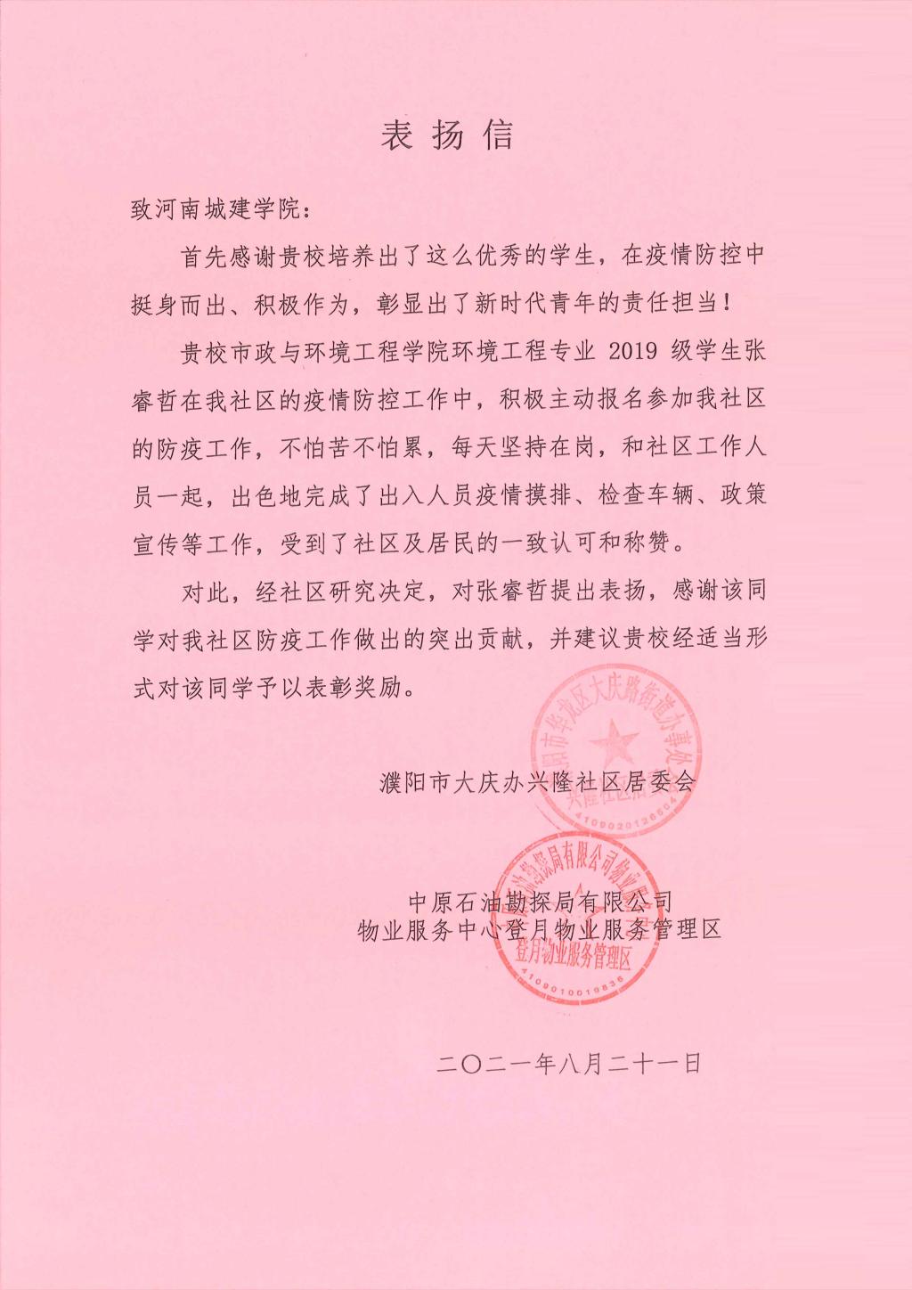 (通讯员:张轩轩)BETWAY必威环境工程专业2019级员工张睿哲在暑期积极投身于濮阳市大庆办兴隆社区的疫情防控,用实际行动助力家乡疫情防控工作,守护家乡群众幸福安全,彰显青春色彩,以无畏的勇气、无私的情怀,冲在疫情防控第一线,践行了“奉献、友爱、互助、进步”的志愿精神,书写了“请党放心,强国有我”的青春答卷。