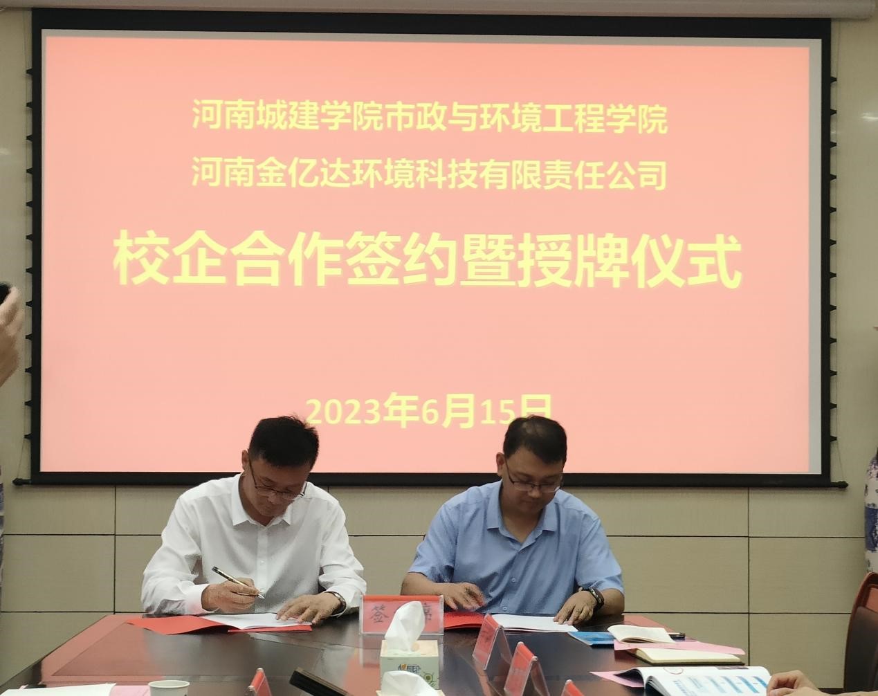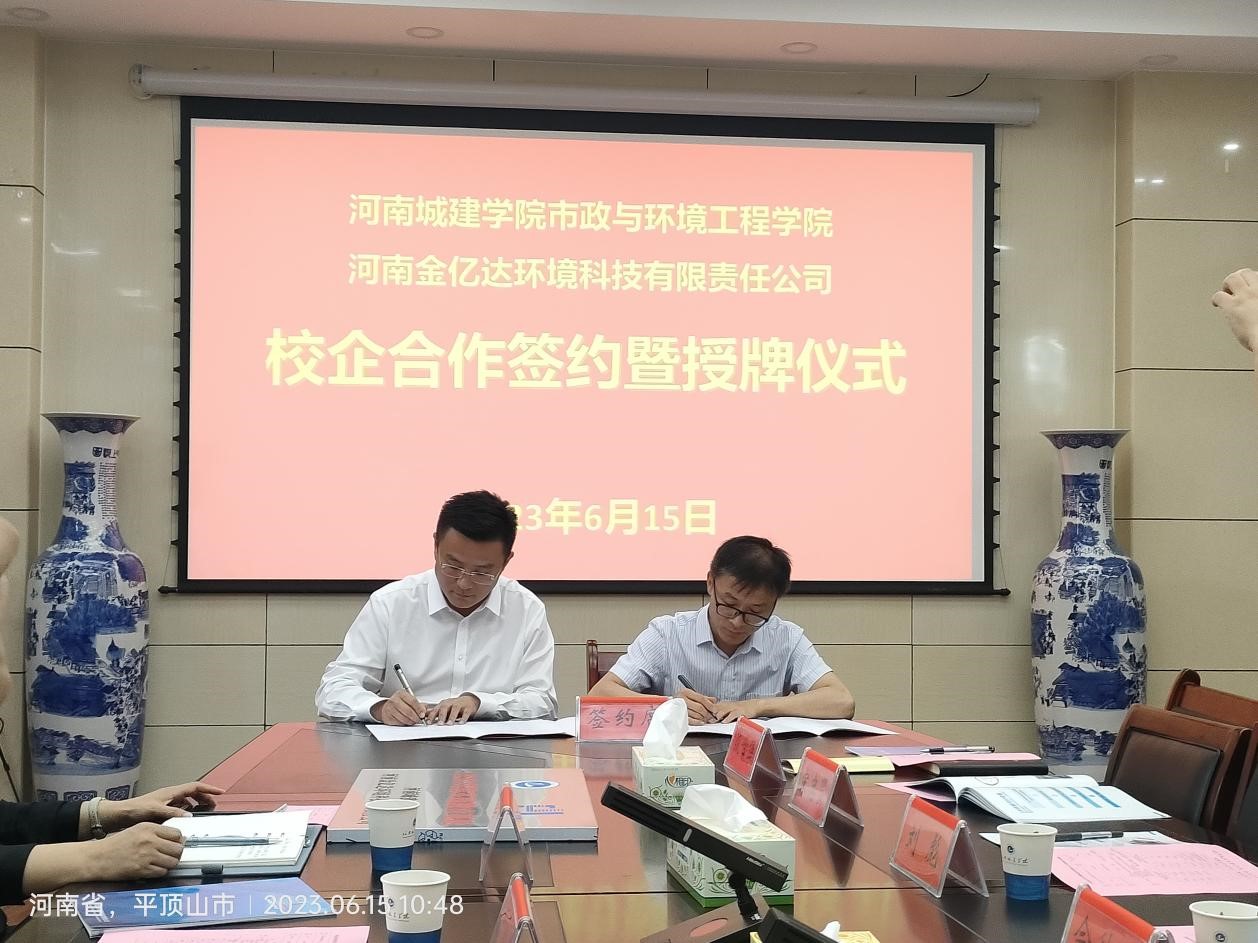 6月15日上午,公司与河南金亿达环境科技有限责任公司校企合作签约仪式在公司会议室举行。河南金亿达环境科技有限责任公司董事长乔晓磊、总经理乔晓广、技术总监史彦明、副总经理张肃冶、办公室主任王运杰以及公司经理朱新锋、副经理吴俊峰、刘彪出席了签约仪式,给排水科学与工程系、环境工程系、城镇先进环保技术河南省工程实验室、科研办等相关负责人参加会议。会议由刘彪主持。