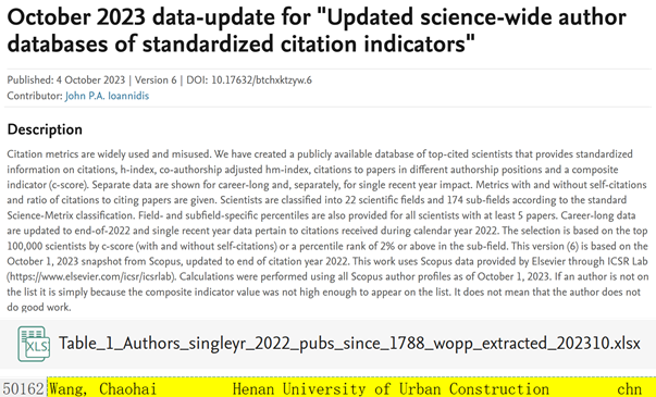 该排名由美国斯坦福大学John P.A. Ioannidis教授团队发表并由Elsevier旗下Mendeley Data发布。Ioannidis团队基于Scopus数据库,使用了一个综合六种引用指标的打分(包括总引用量、Hirsch H-index、共同作者修正的Schreiber Hm-index、单独作者、单独或者第一作者,单独、第一或者最后作者的文章引用量),通过对世界科学家和科学学科的标准化引文指标数据库的长期系统研究,从850多万名科学家里,涵盖文、理、工学科,包括了22个领域和174个子学科,考虑到不同子研究领域的差异,提供了衡量科学家长期科研表现的指标,力求更客观的反映学者的影响力。科学家入选该榜单,意味着他们在各自学科领域具有较高的世界影响力,为该领域的发展作出了突出贡献。