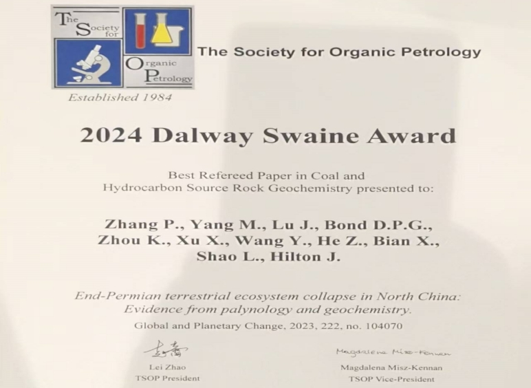 TSOP于1984年在美国成立,是关于有机岩石学、煤岩学、干酪根岩石学、有机地球化学领域具有重要影响的国际性学术组织,旨在团结“煤、油、气”等能源方面的科学与工程技术人员,用煤岩学、油气有机岩学、有机地球化学及相关学科的理论,来解决煤炭、石油、天然气等能源开发与利用过程中遇到的难题。Dal Swaine奖是为纪念著名的澳大利亚能源地质学家Dal Swaine而设立的,旨在表彰在煤和环境地球化学领域做出重要贡献的科学家。该奖项每年在全球范围内仅授予一项研究成果,其权威性和影响力不言而喻。