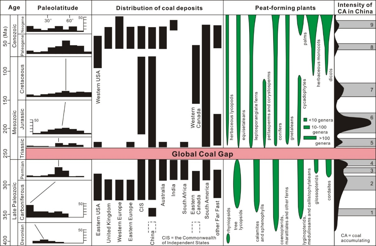 图1植物登陆以来聚煤作用的古纬度变化、煤层分布、聚煤植物和中国的聚煤强度