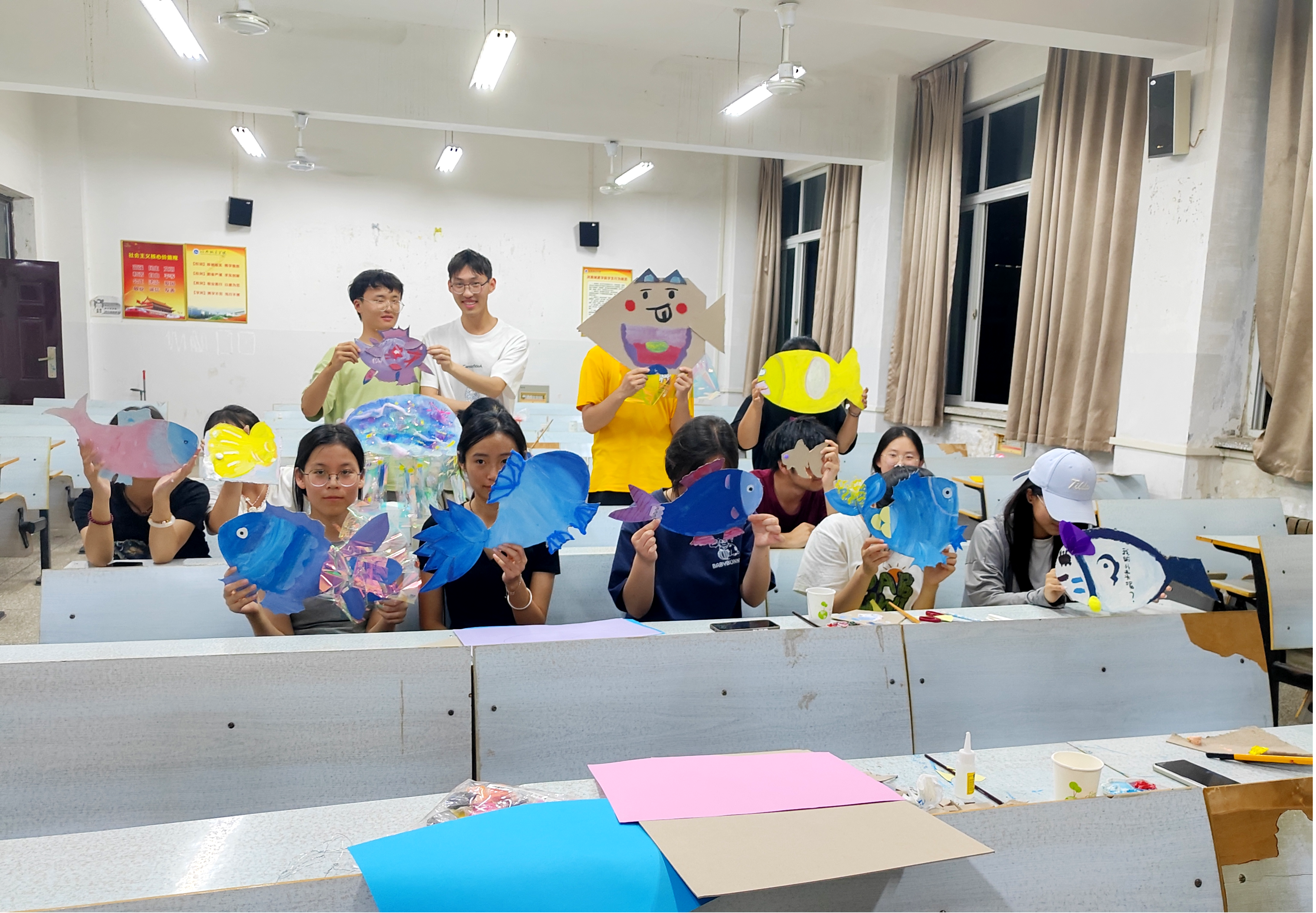 同学们利用废旧纸板剪裁出金鱼的基本形状,用颜料和画笔进行细致的彩绘。充分发挥创造力,制作出各具特色的金鱼摆件。在活动中,参与者们互相分享创作灵感,现场气氛活跃而融洽。