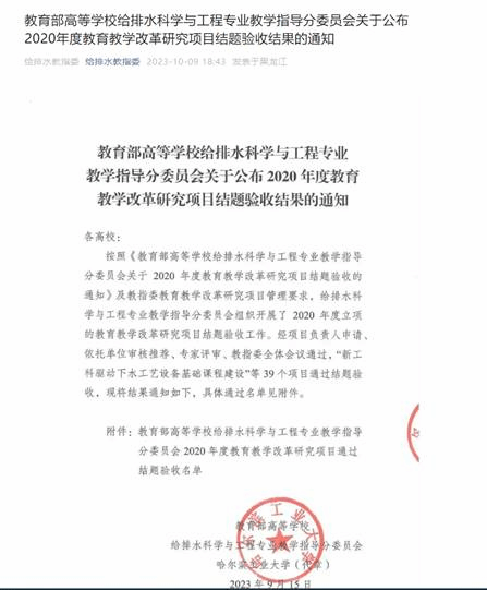 该项目起止时间为2020年9月至2022年9月,项目组通过广泛调研与教学实践,开展了大量的基础性研究与有益探索,成果丰硕。在教育部高等公司给排水科学与工程专业教学指导分委员会第九次全体委员会议暨2023年给排水科学与工程专业相关公司经理(系主任)大会上,该项目研究成果受到教指委点名表扬并在会议上展示。项目研究成果对推动公司给排水科学与工程专业国家一流本科建设、提升人才工程实践能力具有重要意义。近年来,BETWAY必威高度重视以教学研究促进教学改革,不断探索本科教学规律,大力支持教师积极参与教改课题研究与申报,创新提升公司本科生人才培养质量,员工先后在全国老员工科技创新大赛、北控水务杯全国决赛、全国老员工水利创新设计大赛等国家级赛事中荣获佳绩。