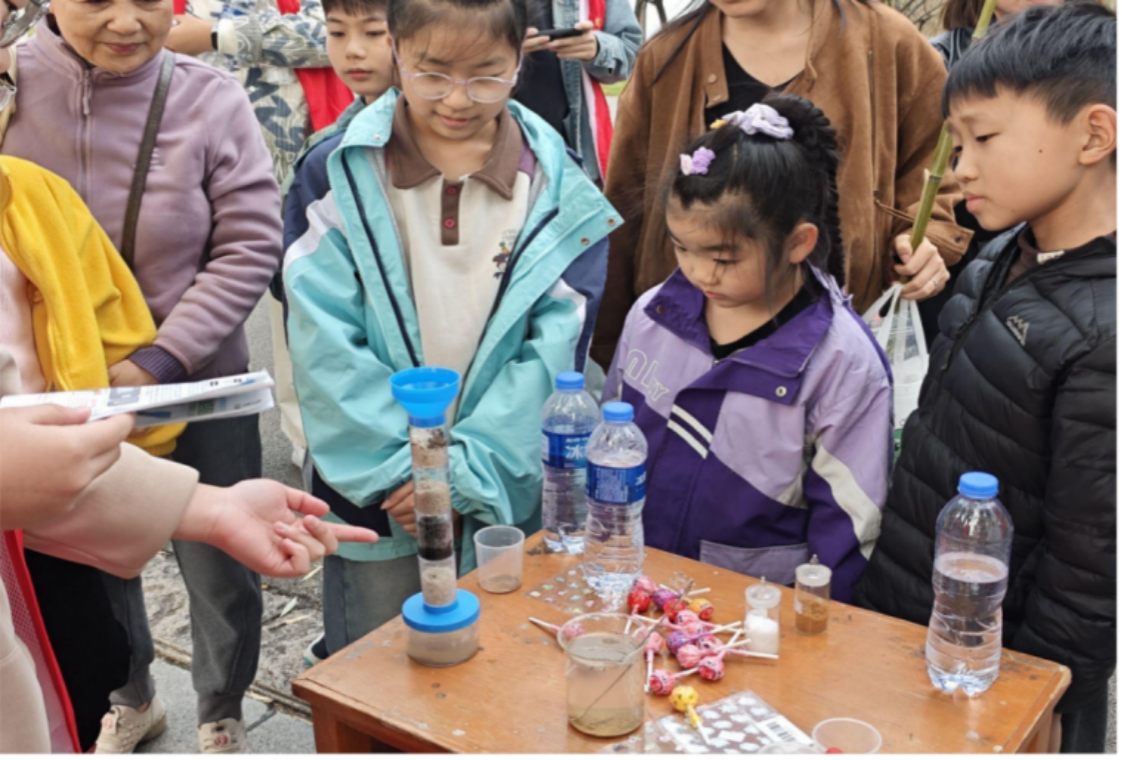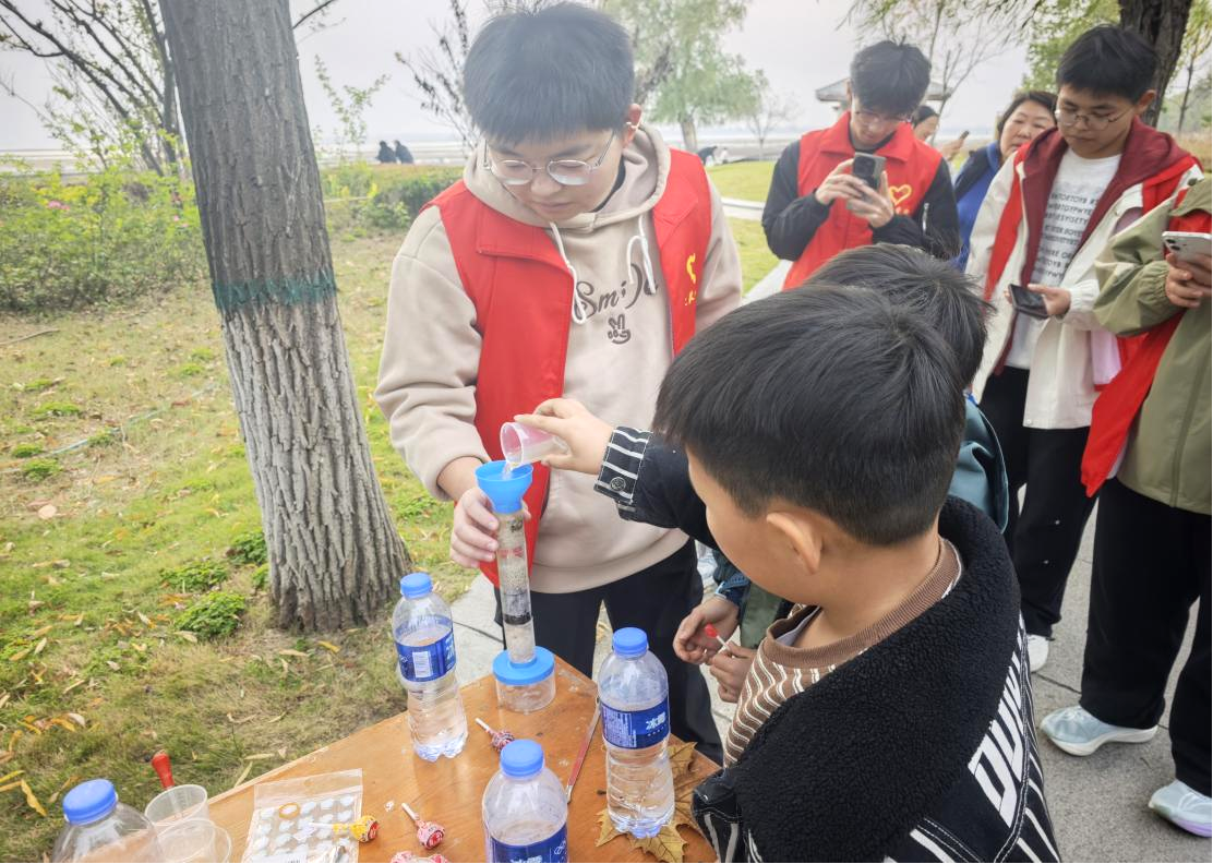 活动以“数据话危机”开篇,“我国人均水资源量仅为世界1/4”等触目惊心的数字,配合白龟湖生态影像,迅速引发学子共鸣。大家深刻认识到,日常易得的水资源,实则承载着紧迫的保护使命。实践环节中,“污水变清”手工坊备受关注。学子们用石子、纱布、活性炭等搭建过滤装置,当浑浊模拟水渗滤成清水时,现场反响热烈。亲身体验让大家直观感受到水质净化的不易,深化了节水认知。另一边,“河流医生”们正用专业工具检测湖水指标,详细记录“水质健康档案”。精准的检测不仅锻炼了专业技能,更让学子们切实体会到湿地生态对水资源的净化价值。活动尾声,学子们分享实践感悟后,共同宣读《青春护水倡议书》,承诺从点滴践行节水。